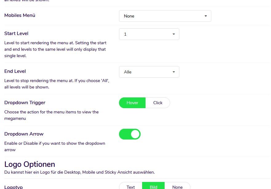 Once you are done with these settings, you can create your own mega menu for individual menu items. The structure of the main level menu items corresponds to the structure of your Joomla menu. By default, all submenu items are automatically displayed as drop-down menu items.
